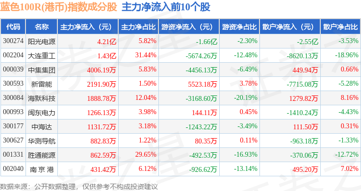 资金流向方面,蓝色100R(港币)(480069)指数成份股当日主力资金净流出合计4.32亿元,游资资金净流出合计9391.61万元,散户资金净流入合计5.26亿元。成份股资金流向详情见下表: