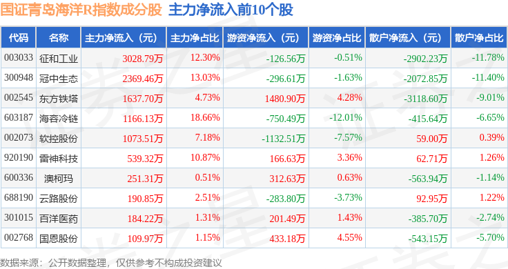 资金流向方面,国证青岛海洋R(480532)指数成份股当日主力资金净流出合计2.28亿元,游资资金净流入合计7787.0万元,散户资金净流入合计1.6亿元。成份股资金流向详情见下表: