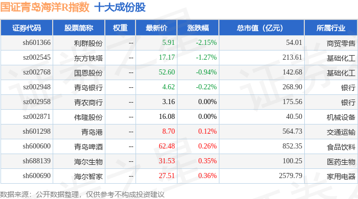 国证青岛海洋R(480532)指数十大成份股详情如下: