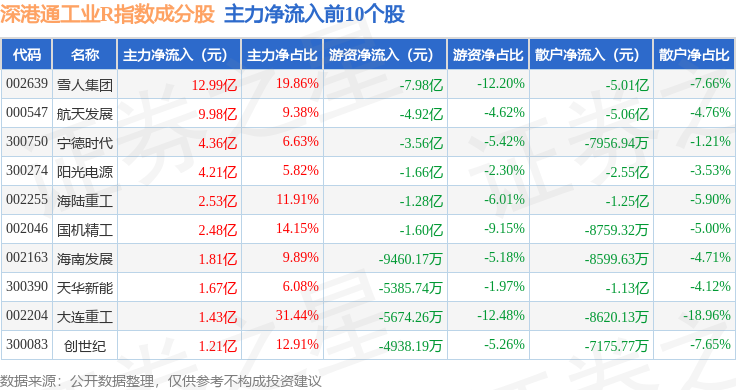 资金流向方面,深港通工业R(483017)指数成份股当日主力资金净流入合计14.44亿元,游资资金净流出合计30.25亿元,散户资金净流入合计15.81亿元。成份股资金流向详情见下表: