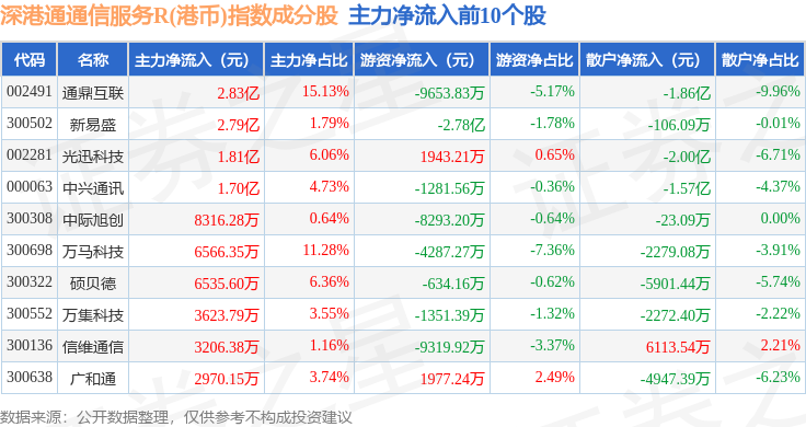 资金流向方面,深港通通信服务R(港币)(483034)指数成份股当日主力资金净流出合计5181.14万元,游资资金净流出合计7.63亿元,散户资金净流入合计8.15亿元。成份股资金流向详情见下表: