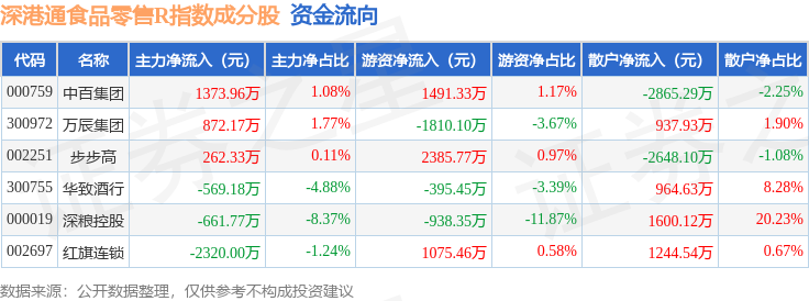 资金流向方面,深港通食品零售R(483037)指数成份股当日主力资金净流出合计1042.5万元,游资资金净流入合计1808.67万元,散户资金净流出合计766.18万元。成份股资金流向详情见下表: