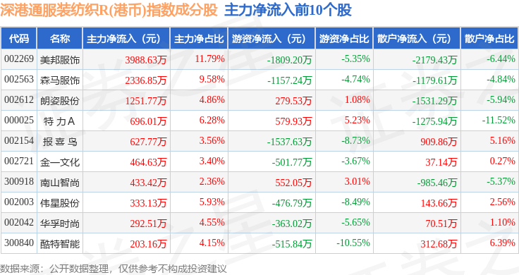 资金流向方面,深港通服装纺织R(港币)(483042)指数成份股当日主力资金净流入合计8470.71万元,游资资金净流出合计5691.35万元,散户资金净流出合计2779.36万元。成份股资金流向详情见下表: