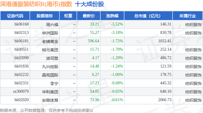 深港通服装纺织R(港币)(483042)指数十大成份股详情如下: