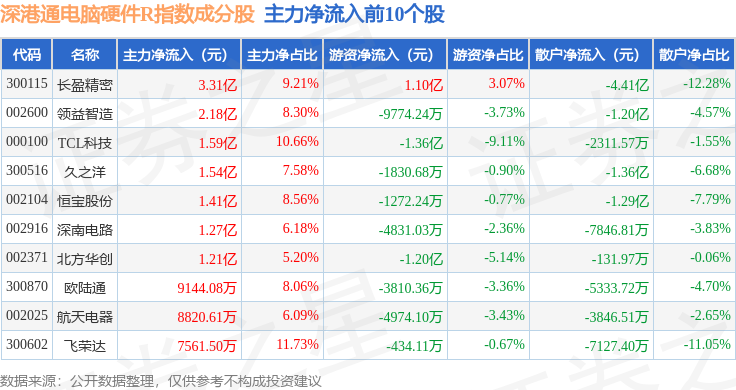 资金流向方面,深港通电脑硬件R(483043)指数成份股当日主力资金净流出合计20.98亿元,游资资金净流出合计1.43亿元,散户资金净流入合计22.42亿元。成份股资金流向详情见下表: