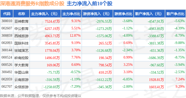 资金流向方面,深港通消费服务R(483045)指数成份股当日主力资金净流入合计1.12亿元,游资资金净流出合计8298.14万元,散户资金净流出合计2877.41万元。成份股资金流向详情见下表:
