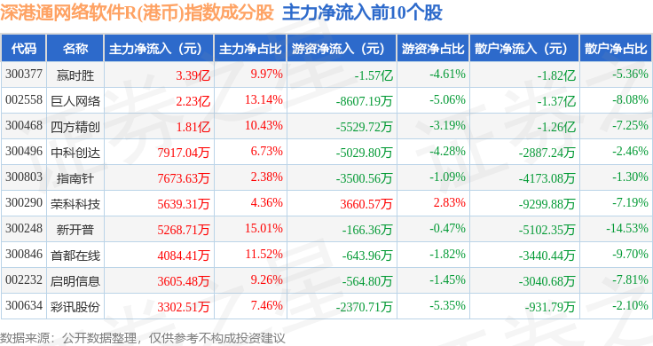 资金流向方面,深港通网络软件R(港币)(483048)指数成份股当日主力资金净流出合计211.3万元,游资资金净流出合计5.28亿元,散户资金净流入合计5.31亿元。成份股资金流向详情见下表: