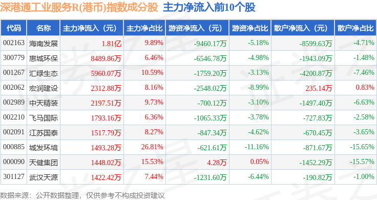 资金流向方面,深港通工业服务R(港币)(483056)指数成份股当日主力资金净流出合计3.12亿元,游资资金净流出合计3.16亿元,散户资金净流入合计6.28亿元。成份股资金流向详情见下表: