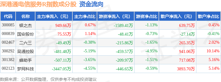 资金流向方面,深港通电信服务R(483057)指数成份股当日主力资金净流出合计3459.93万元,游资资金净流出合计2969.87万元,散户资金净流入合计6429.8万元。成份股资金流向详情见下表:
