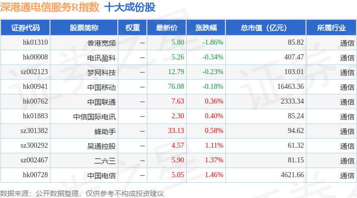 深港通电信服务R(483057)指数十大成份股详情如下: