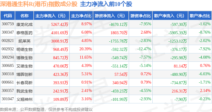 资金流向方面,深港通生科R(港币)(483060)指数成份股当日主力资金净流出合计1709.39万元,游资资金净流出合计4478.74万元,散户资金净流入合计6188.13万元。成份股资金流向详情见下表: