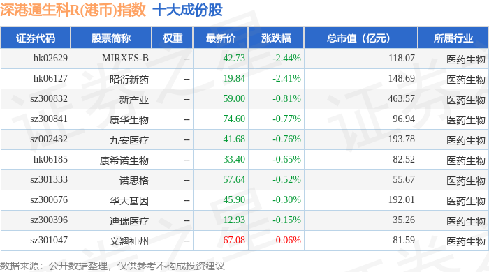 深港通生科R(港币)(483060)指数十大成份股详情如下: