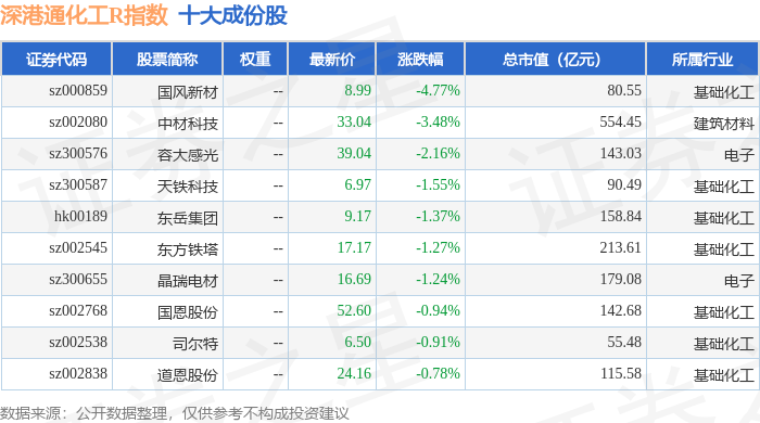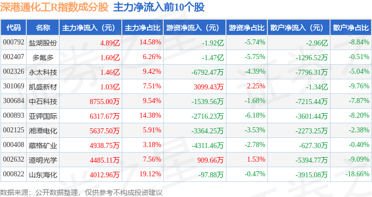 资金流向方面,深港通化工R(483063)指数成份股当日主力资金净流入合计4.16亿元,游资资金净流出合计4.83亿元,散户资金净流入合计6715.08万元。成份股资金流向详情见下表: