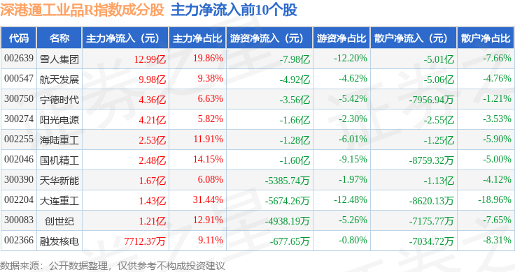 资金流向方面,深港通工业品R(483069)指数成份股当日主力资金净流入合计18.81亿元,游资资金净流出合计26.67亿元,散户资金净流入合计7.86亿元。成份股资金流向详情见下表: