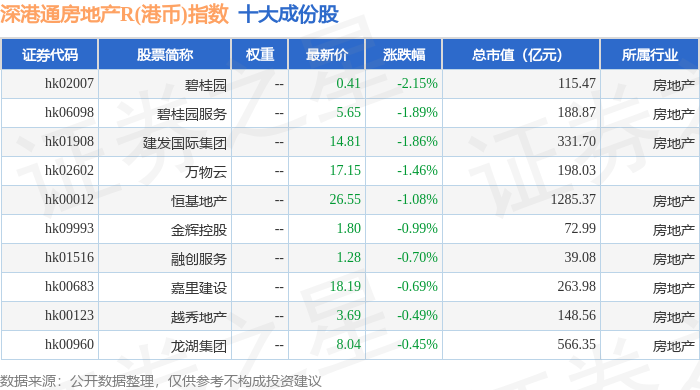 深港通房地产R(港币)(483072)指数十大成份股详情如下: