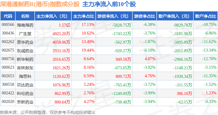 资金流向方面,深港通制药R(港币)(483080)指数成份股当日主力资金净流出合计5.6亿元,游资资金净流出合计8878.37万元,散户资金净流入合计6.49亿元。成份股资金流向详情见下表: