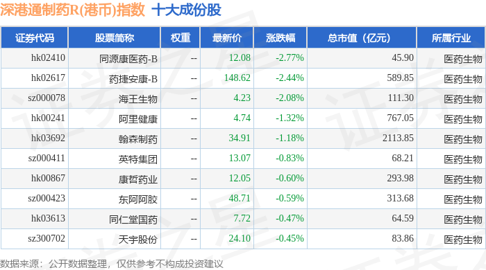 深港通制药R(港币)(483080)指数十大成份股详情如下: