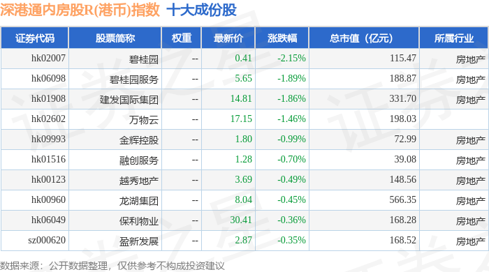 深港通内房股R(港币)(483084)指数十大成份股详情如下: