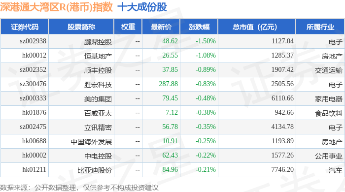 深港通大湾区R(港币)(483090)指数十大成份股详情如下:
