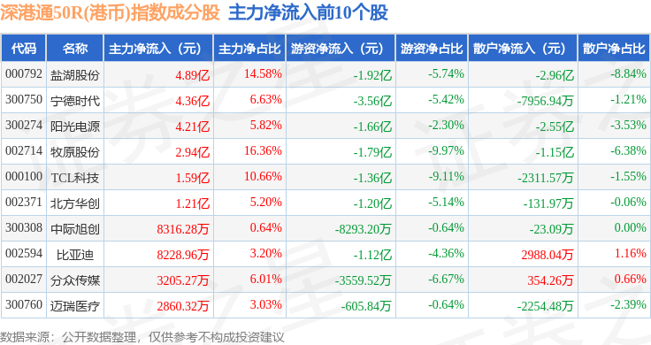 资金流向方面,深港通50R(港币)(483092)指数成份股当日主力资金净流入合计9.56亿元,游资资金净流出合计12.77亿元,散户资金净流入合计3.21亿元。成份股资金流向详情见下表: