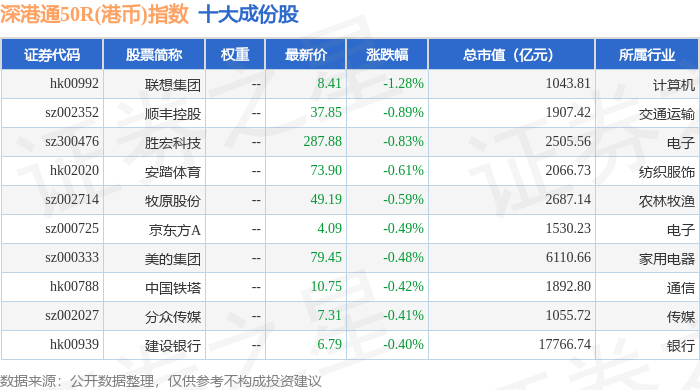 深港通50R(港币)(483092)指数十大成份股详情如下: