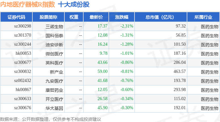 内地医疗器械R(483103)指数十大成份股详情如下: