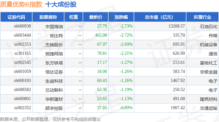 资金流向方面,质量优势R(489017)指数成份股当日主力资金净流出合计1.55亿元,游资资金净流出合计5.93亿元,散户资金净流入合计7.48亿元。成份股资金流向详情见下表:
