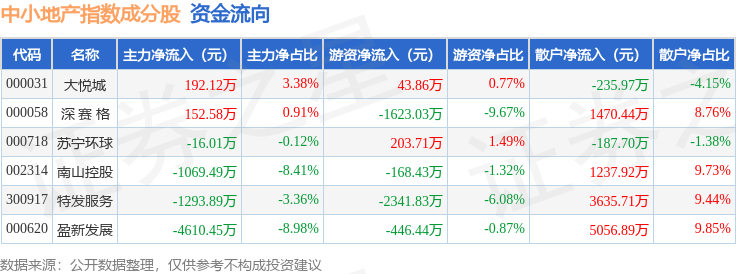 资金流向方面,中小地产(971002)指数成份股当日主力资金净流出合计6645.13万元,游资资金净流出合计4332.15万元,散户资金净流入合计1.1亿元。成份股资金流向详情见下表: