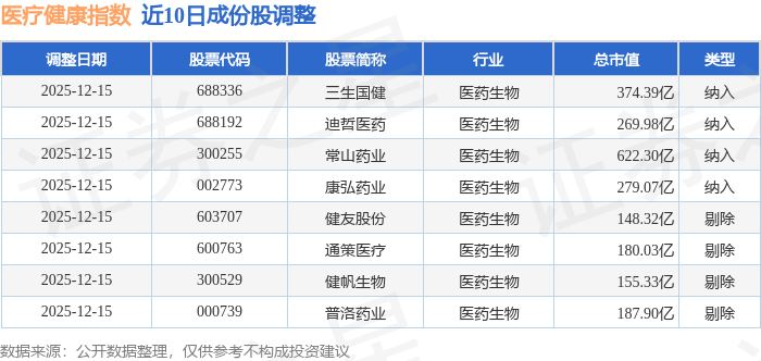 近10日内医疗健康(980016)指数成份股做了调整,新纳入了4只股票,剔除了4只股票。