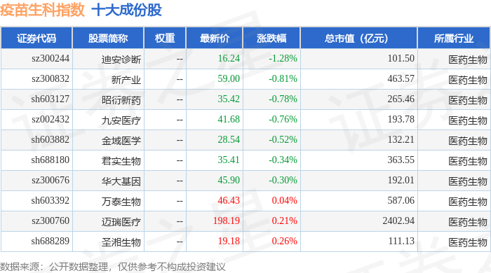 近10日内疫苗生科(980015)指数成份股做了调整,新纳入了2只股票,剔除了2只股票。