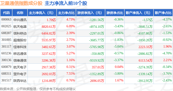 资金流向方面,卫星通信(980018)指数成份股当日主力资金净流出合计27.28亿元,游资资金净流入合计4.4亿元,散户资金净流入合计22.65亿元。成份股资金流向详情见下表: