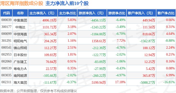 资金流向方面,湾区海洋(980019)指数成份股当日主力资金净流出合计3601.5万元,游资资金净流入合计2825.46万元,散户资金净流入合计776.04万元。成份股资金流向详情见下表: