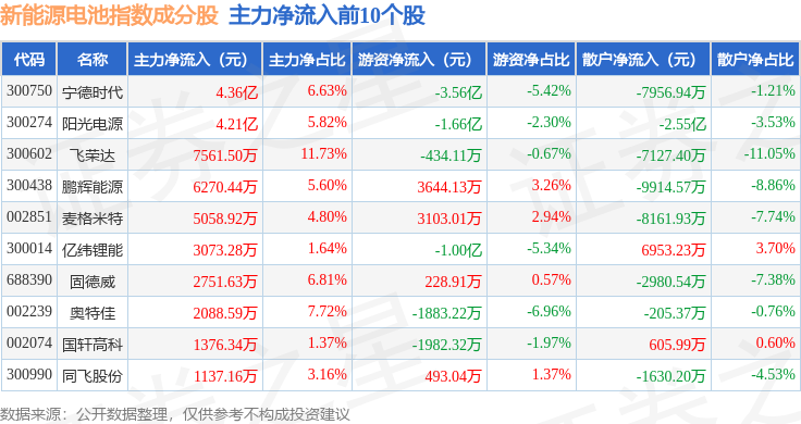 资金流向方面,新能源电池(980027)指数成份股当日主力资金净流入合计3.27亿元,游资资金净流出合计4.77亿元,散户资金净流入合计1.5亿元。成份股资金流向详情见下表: