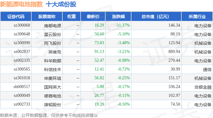 证券之星消息,12月19日,新能源电池(980027)指数报收于3298.05点,涨0.26%,成交434.52亿元,换手率2.06%。当日该指数成份股中,上涨的有38家,西子洁能以5.29%的涨幅领涨,下跌的有11家,南都电源以11.37%的跌幅领跌。