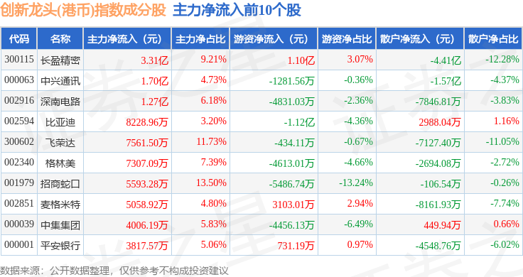 资金流向方面,创新龙头(港币)(980037)指数成份股当日主力资金净流出合计3.97亿元,游资资金净流出合计2.82亿元,散户资金净流入合计6.79亿元。成份股资金流向详情见下表: