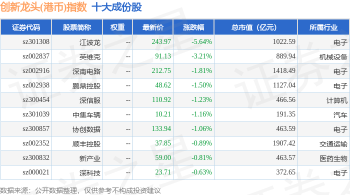 创新龙头(港币)(980037)指数十大成份股详情如下: