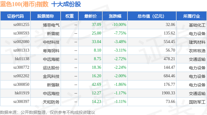 蓝色100(港币)(980069)指数十大成份股详情如下: