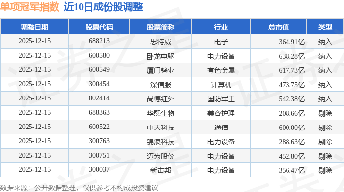 近10日内单项冠军(980150)指数成份股做了调整,新纳入了5只股票,剔除了5只股票。