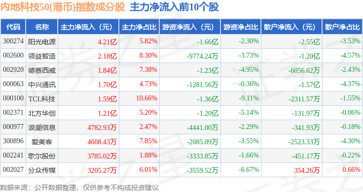 资金流向方面,内地科技50(港币)(983004)指数成份股当日主力资金净流入合计8.82亿元,游资资金净流出合计7.33亿元,散户资金净流出合计1.49亿元。成份股资金流向详情见下表:
