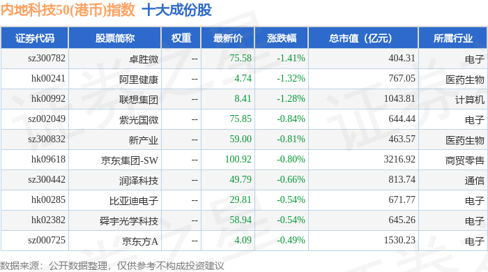 内地科技50(港币)(983004)指数十大成份股详情如下: