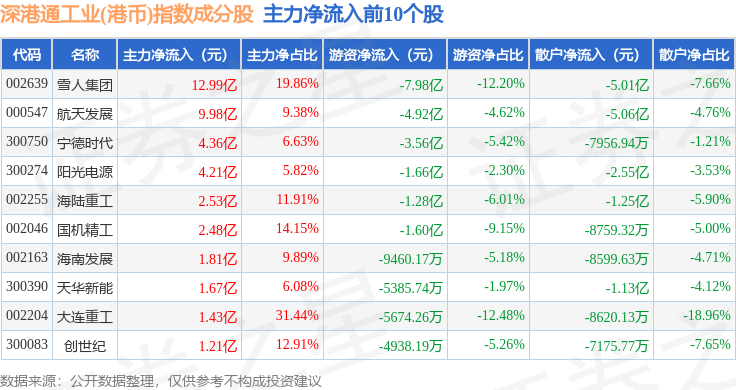 资金流向方面,深港通工业(港币)(983018)指数成份股当日主力资金净流入合计14.44亿元,游资资金净流出合计30.25亿元,散户资金净流入合计15.81亿元。成份股资金流向详情见下表: