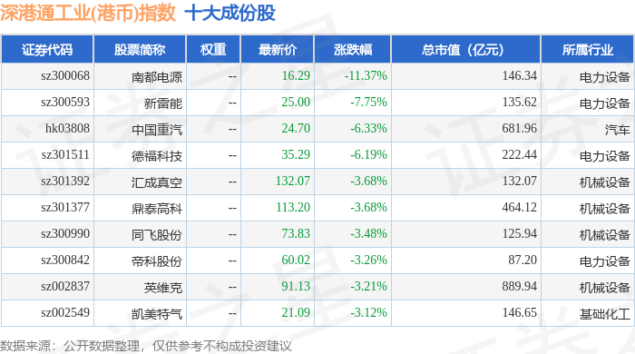 深港通工业(港币)(983018)指数十大成份股详情如下:
