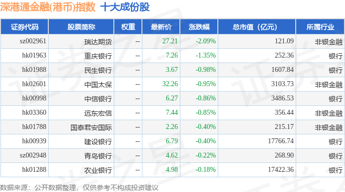 深港通金融(港币)(983026)指数十大成份股详情如下: