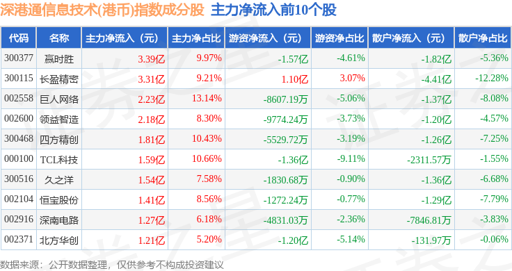 资金流向方面,深港通信息技术(港币)(983028)指数成份股当日主力资金净流出合计37.47亿元,游资资金净流出合计7324.84万元,散户资金净流入合计38.2亿元。成份股资金流向详情见下表: