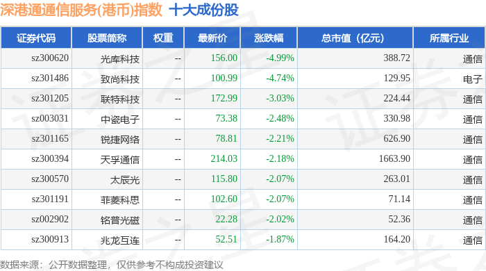 深港通通信服务(港币)(983034)指数十大成份股详情如下: