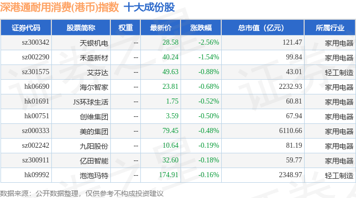 深港通耐用消费(港币)(983050)指数十大成份股详情如下: