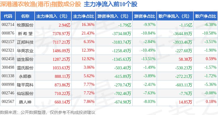 资金流向方面,深港通农牧渔(港币)(983052)指数成份股当日主力资金净流入合计4.11亿元,游资资金净流出合计2.43亿元,散户资金净流出合计1.69亿元。成份股资金流向详情见下表: