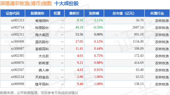深港通农牧渔(港币)(983052)指数十大成份股详情如下: