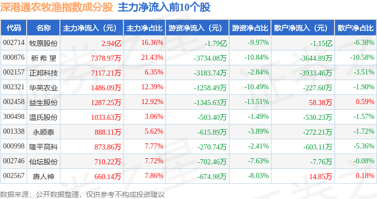 资金流向方面,深港通农牧渔(983051)指数成份股当日主力资金净流入合计4.11亿元,游资资金净流出合计2.43亿元,散户资金净流出合计1.69亿元。成份股资金流向详情见下表: