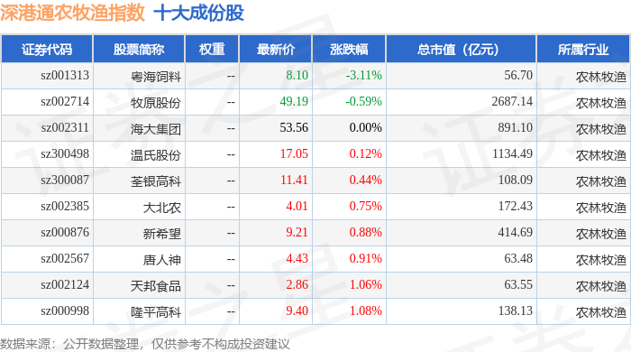 深港通农牧渔(983051)指数十大成份股详情如下: